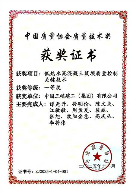 12月3日,2025年度中国质量协会质量技术奖在北京揭晓并颁奖。三峡建工“低热水泥混凝土筑坝质量控制关键技术”项目,凭借硬核创新与显著成效斩获一等奖,成为清洁能源领域质量标杆。
