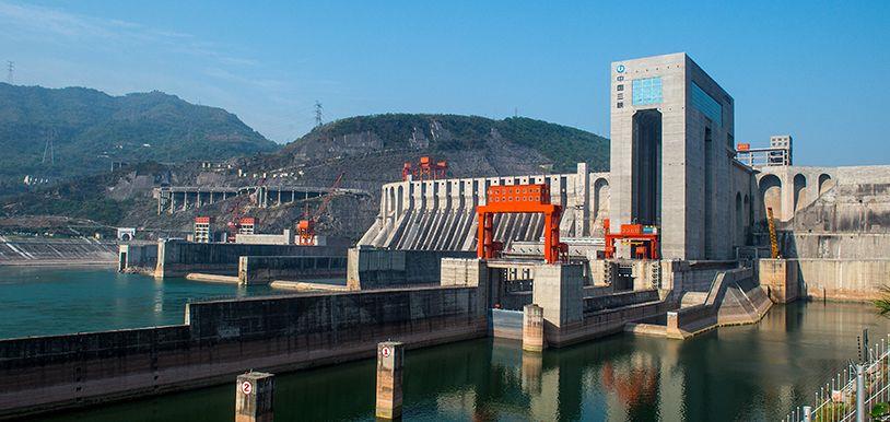 向家坝水电站是金沙江下游河段水电开发规划中的第四个梯级电站,电站以发电为主,同时改善航运条件,兼顾防洪、灌溉,并具有拦沙和对溪洛渡水电站进行反调节等作用,最大容量6400MW。电站枢纽建筑物主要由混凝土重力坝、左岸坝后厂房、右岸地下厂房、左岸垂直升船机、冲排沙建筑物和两岸灌溉取水口等组成,总库容51.63亿m3,左右岸发电厂房各安装4台单机最大容量为800MW的水轮发电机组。工程于2004年7月开始筹建,2006年11月主体工程开工,2012年11月首批机组发电,2014年7月全部机组投产发电。