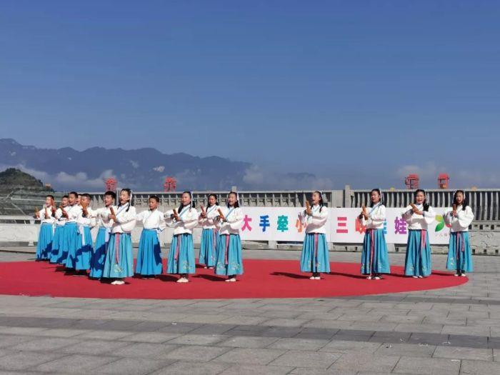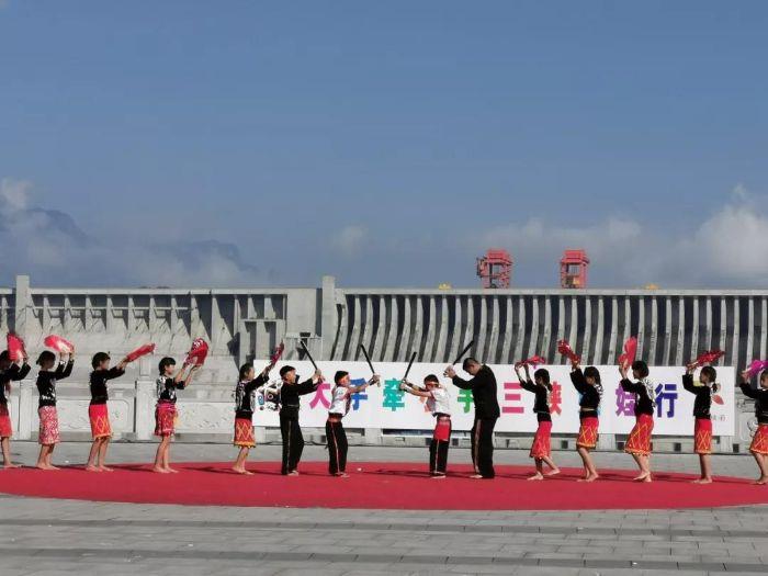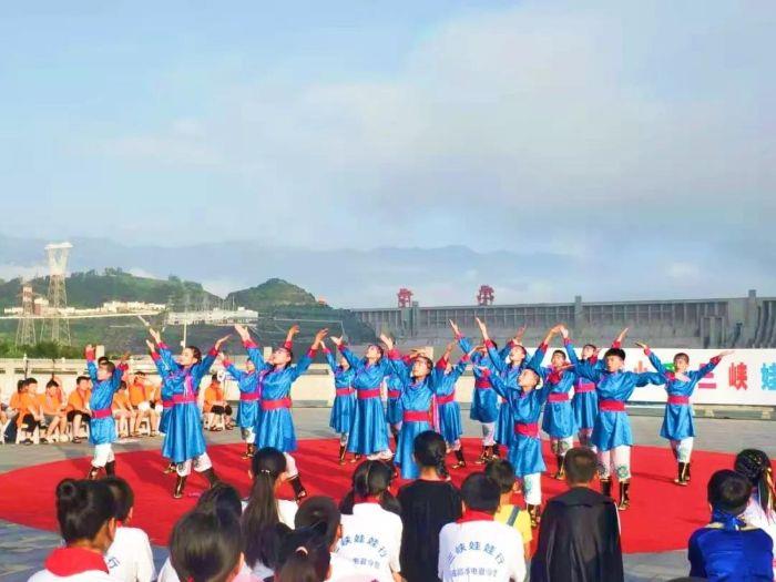 紧接着,重庆奉节队表演古诗吟唱《峡江诗情》,重庆巫山队表演舞蹈《土家娃娃耍连萧》,宜昌夷陵区队表演儿童剧《闹闹与精灵》,江西万安队表演舞蹈《斑鸠调》,湖北秭归队表演舞蹈《我在茶乡等你来》,内蒙古、江西两地小学生合作表演情景剧《握紧你的手》。整场演出最后,全场孩子齐唱《我和我的祖国》,同唱歌曲《种下一个梦》,歌声的优美旋律在大坝下回响。