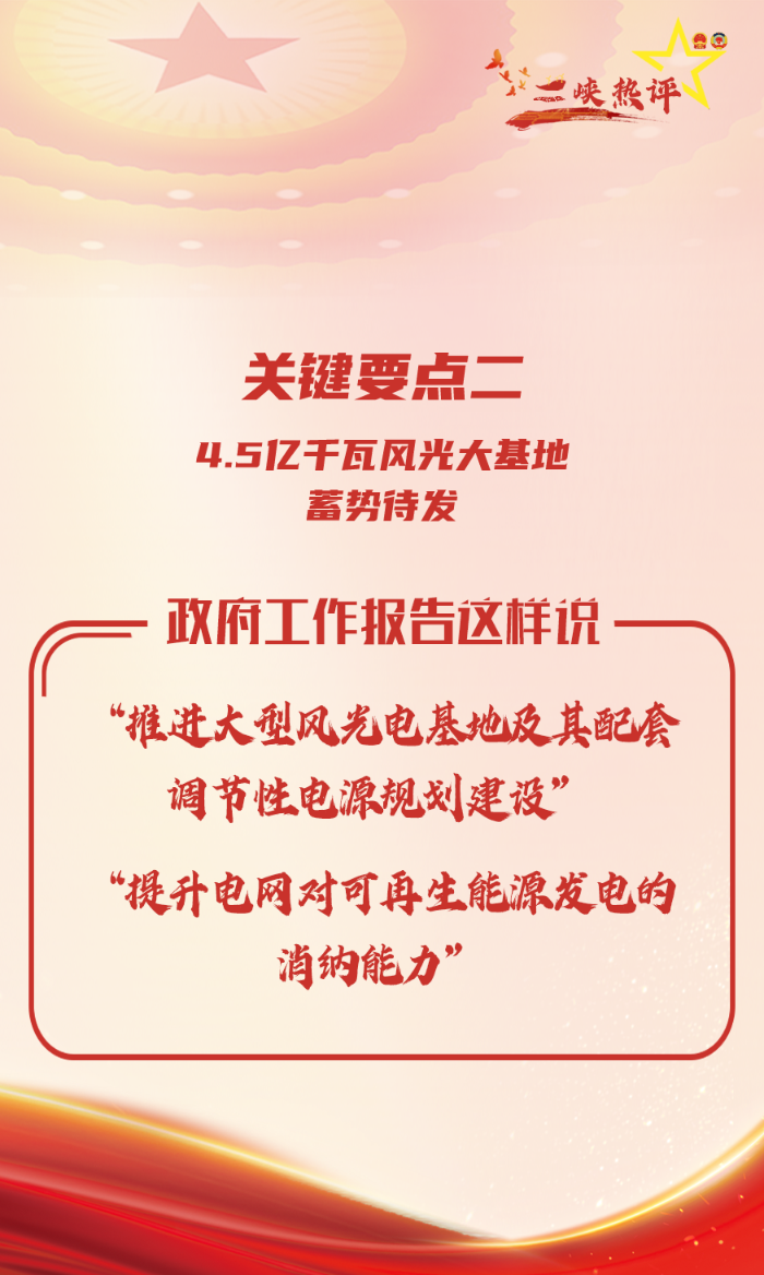 2020年、2021年政府工作报告分别提出“发展可再生能源”、“大力发展新能源”,今年的政府工作报告则是具体指向“推进大型风光电基地及其配套调节性电源规划建设”,并同时提出“提升电网对可再生能源发电的消纳能力”。