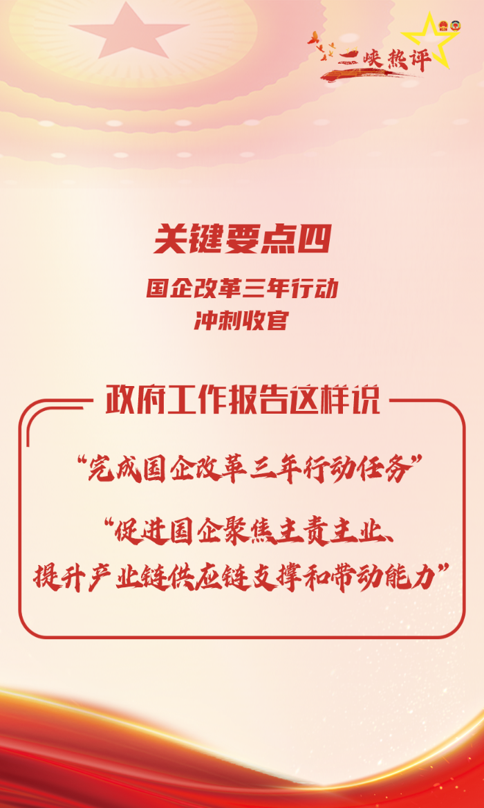 今年是国企改革三年行动决战决胜之年。政府工作报告提出,完成国企改革三年行动任务,加快国有经济布局优化和结构调整,加强国有资产监管,促进国企聚焦主责主业、提升产业链供应链支撑和带动能力。