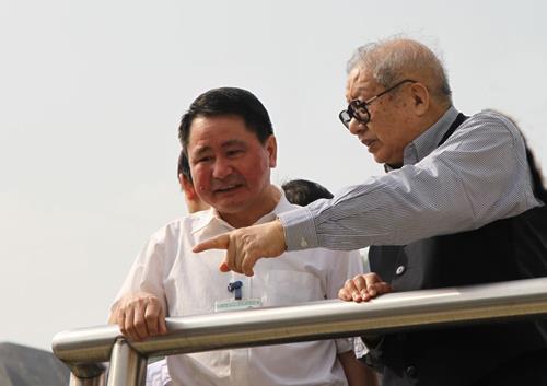 | 图为蒋祝平(右)察看双线五级船闸的运行情况。(华吟江 摄) |