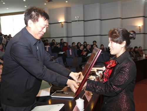 | 中国三峡集团公司党组成员、纪检组组长于文星为荣获全国五一巾帼标兵岗称号的代表颁奖。(张伟国 摄) |