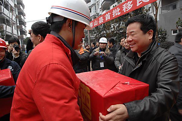 本网讯(王波 高峰 报道)新春佳节将至,冒着霏霏细雨,1月18日,四川省委常委、副省长钟勉,中国三峡集团总经理陈飞、副总经理毕亚雄一行深入向家坝水电站库区屏山县考察城集镇移民迁建工作,出席该县首批城市移民安置房钥匙发放活动,向移民拜年,为移民群众送上新春的祝福。