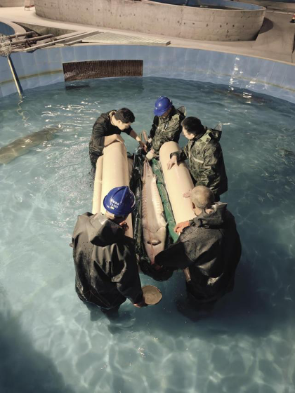 ▲ 科研人员正在为放流中华鲟植入声呐标记