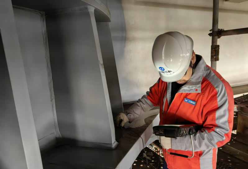 殷学成从事的工作叫金属结构无损探伤检测,它是一种在不损害被检测对象使用性能的前提下,利用声、光、磁、电等物理原理对材料内部及表面缺陷进行检测的技术。无损探伤检测是海上风电金属结构产品的原材料、焊接质量控制过程中非常重要的一环。