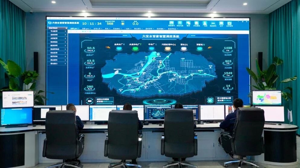 三峡集团安徽六安水管家智慧调控中心,运维人员鼠标轻点,一张数字大屏映入眼帘,城区27个泵站、8个水质净化厂、4座供水厂、5个调蓄池、1座中水厂、1座污泥处理中心,以及4000多公里供排水管网的数据状态清晰可见。