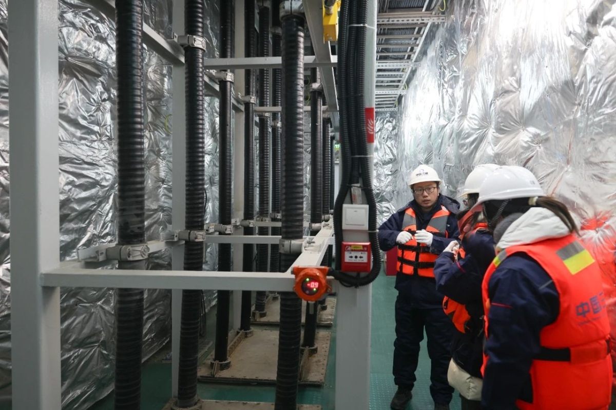 ▲ 运维人员在海上升压站上进行例行巡视检查