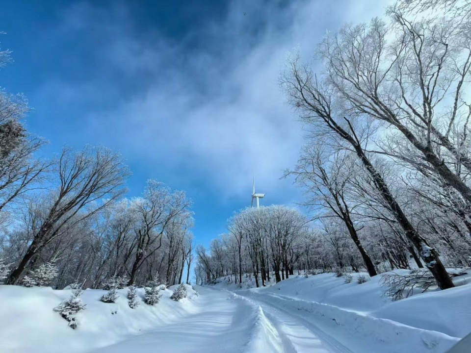 冬季的大个岭风电场,银装素裹,洁白的风机在崇山峻岭巍然屹立,林海雪原的风正被源源不断地转换为绿色电力。