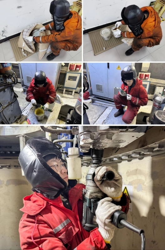 第二天早上7时许,韩岩和林立昆带着维修小组出发,对53号风机进行维修,经过11个小时的工作,偏航系统闸机更换完毕,接下来需要重新注入润滑油。